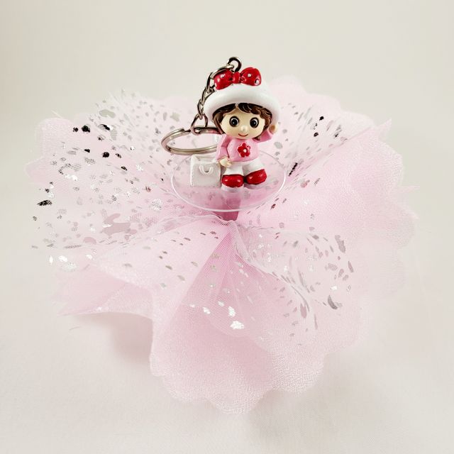 Pour le baptême ou la naissance de votre fille, opter pour ce ravissant porte-clé fillette c'est offrir à vos invités un souvenir à la fois utile et joli.Il vous sera livré garni de tulles contenant les dragées: confectionné par mes soins.
