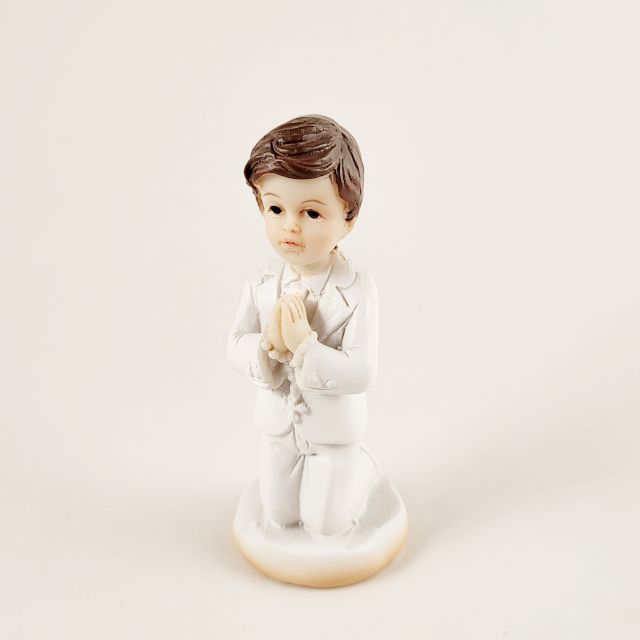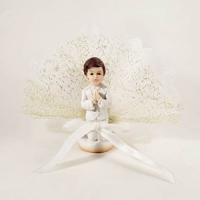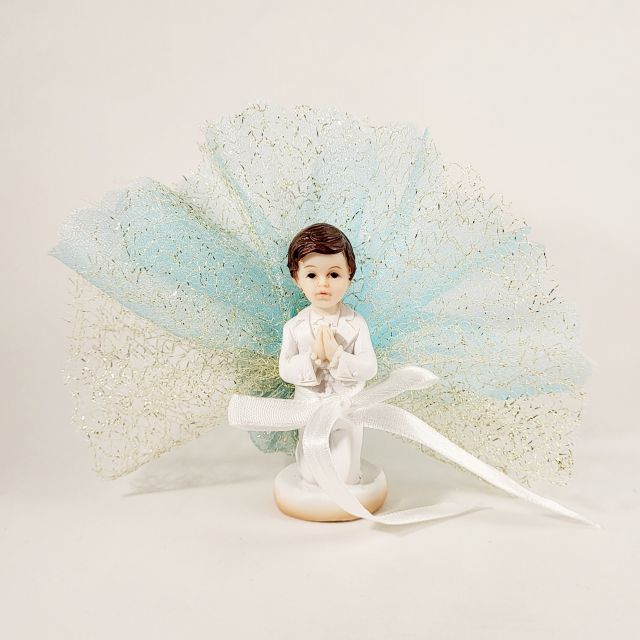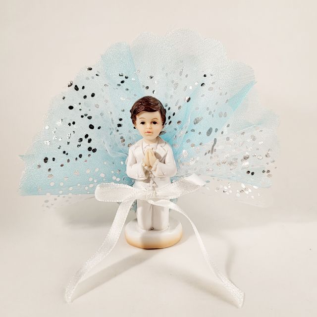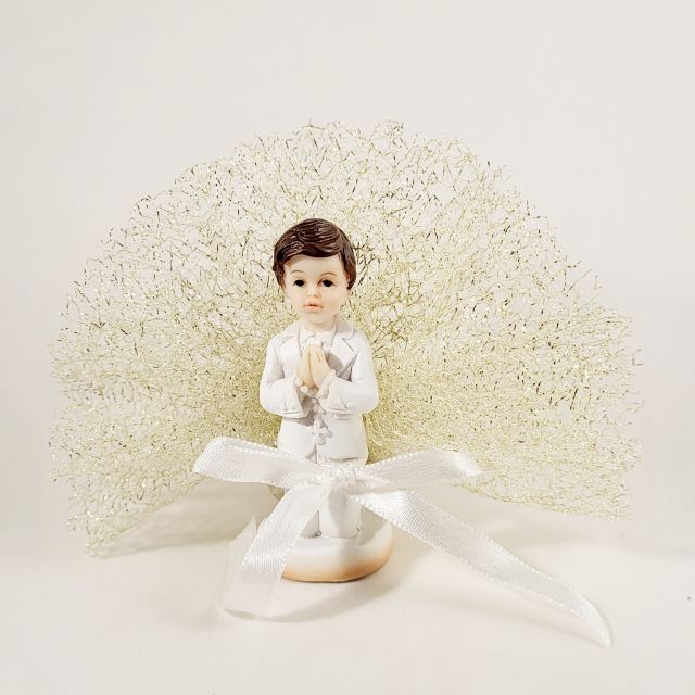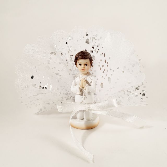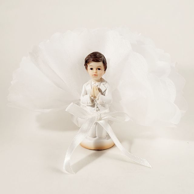 Bonbonnière de communion pour une fête de communion traditionnelle. Ce communiant à genoux en est une belle représentation. Les croyants seront ravis de recevoir ce joli remerciement pour leur présence.